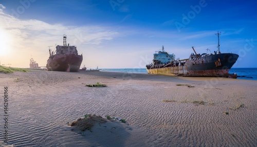 © Simon, Fototapeta premium Abandoned rust ships on dry bottom