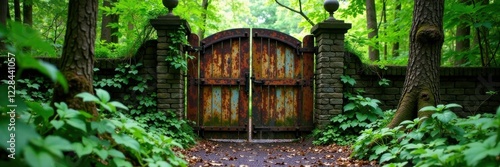 Fototapeta premium Abandoned, rusty gate in a wooded area with vines covering it, nature, gate