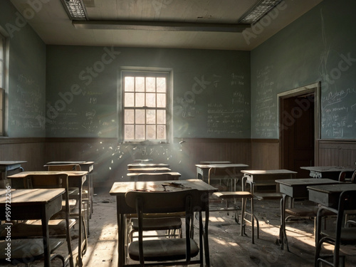 Fototapeta premium abandoned school, Emotional, with a focus on the empty, decaying classroom...