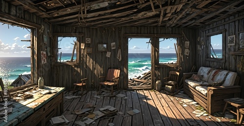 Fototapeta premium abandoned shack hut interior on beach ocean coast in summer. old wood house...