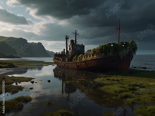 © Sokimimi Studio, Fototapeta premium Abandoned Shipwreck on a Rocky Coast with Dramatic Clouds