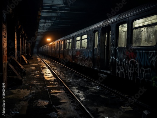 Naklejka premium Abandoned subway train in a dark underground station with graffiti