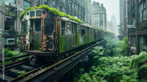 Naklejka premium Abandoned subway train with city debris with green plants growing. Post...