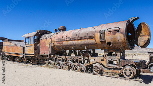 Naklejka premium Abandoned train cemetery with 100-year-old steam locomotives in Uyuni (Bolivia). They were used by mining companies in the 1900.