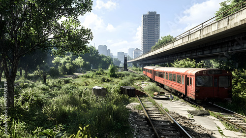© artzone, Obraz premium Abandoned Train on Railway with Overgrown Vegetation in Urban Landscape