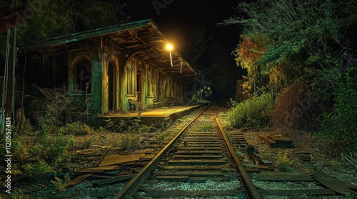 Naklejka premium Abandoned Train Station Overgrown With Vegetation At Night