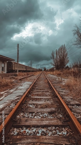 Fototapeta premium Abandoned Train Station with Rusted Tracks in Desolation