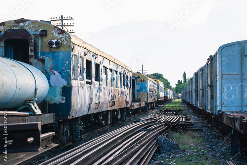 © phadsanu, Fototapeta premium Abandoned trains and an old iron trestle bridge