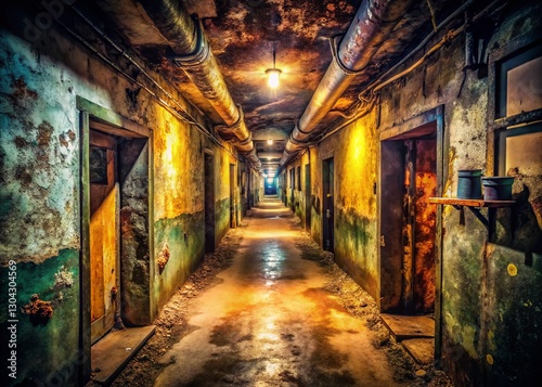 Fototapeta premium Abandoned Underground Bunker Corridor: Shabby Walls, Low Light, Tilt-Shift...