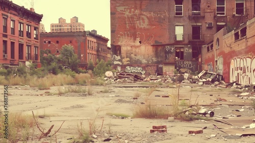 Obraz premium Abandoned urban site with overgrown vegetation and graffiti