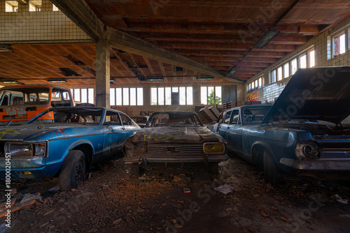 © Carismarkus, Fototapeta premium Abandoned vintage cars inside derelict Charbonnage du Renard workshop, Belgium