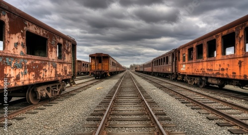 © Aziz, Fototapeta premium abandoned vintage train carriages decaying on rusty railway tracks under dramatic cloudy skies