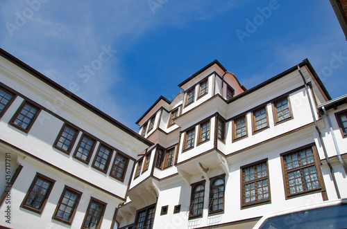 © Marko, Naklejka premium Abandoned white old house vintage style with wooden windows on clear blue sky