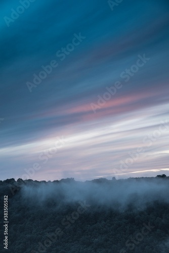 © Kathy, Fototapeta premium Abend Nebel über Landschaft mit bewaldetem Tal