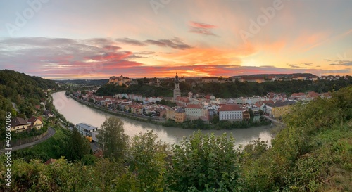 © zauberblicke, Fototapeta premium Abendrot über der Altstadt von Burghausen