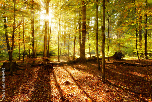 Obraz premium Abends im Wald, goldenes Licht, Sonne strahlt durchs herbstliche Laub