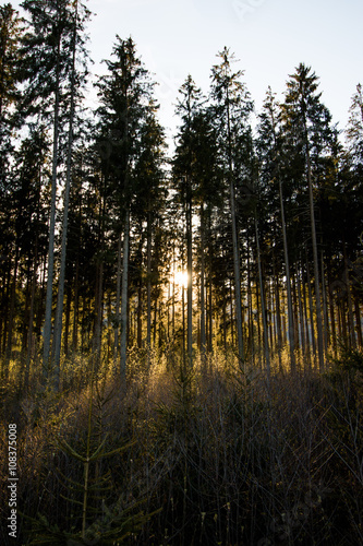 © Patrick Daxenbichler, Obraz premium Abendsonne bricht durch den Wald