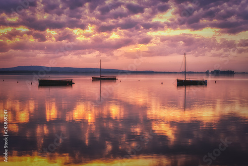 © Leinemeister, Naklejka premium Abendstimmung am Steinhuder Meer mit drei Segelbooten nach dem Sonnenuntergang
