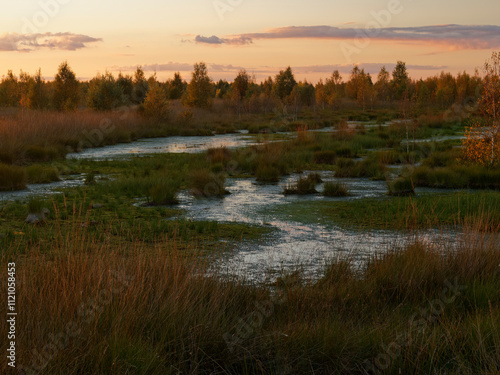 © dina, Fototapeta premium Abendstimmung im Rehdener Geestmoor bei Rehden, Naturpark Dümmer, Landkreis Diepholz, Niedersachsen, Deutschland