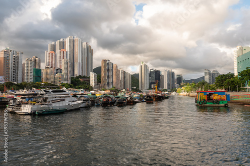 © kingrobert, Fototapeta premium Aberdeen Harbour seen from Ap Lei Chau Bridge, In this area you will find fishing boats, houseboats, and sampans, The bay between the south coast of Hong Kong Island