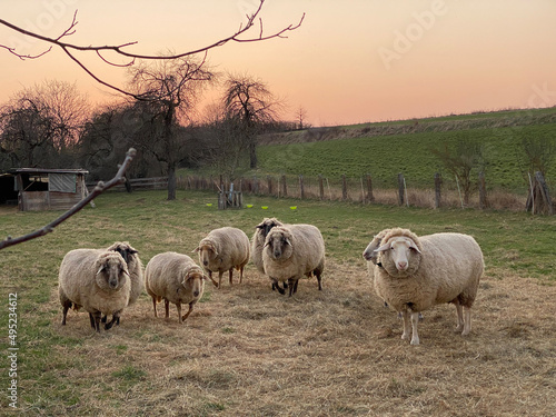 © Petra, Fototapeta premium Abgegrenzte Weide darauf Schafe im Sonnenuntergang