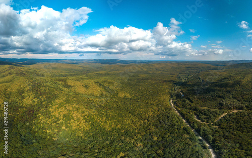 © Alexei Merinov, Fototapeta premium above the road to the village of Mirny (Western Caucasus. South of Russia) in early autumn - in the mountains the higher. the leaves are yellower