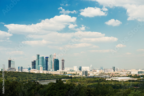 © Valeri Luzina, Fototapeta premium above view Moscow cityscape and blue clouds