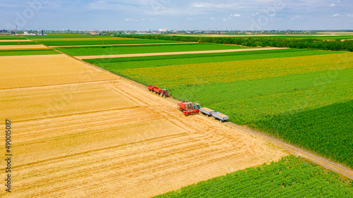 © Roman_23203, Obraz premium Above view on combine as taking position for transferring freshly harvested cereal into trailer