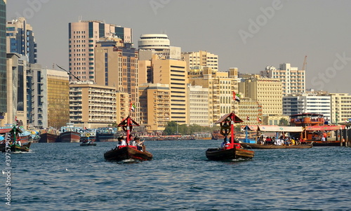© thauwald-pictures, Fototapeta premium Abras auf dem Dubai-Creek mit Panorama Dubais im Hintergrund