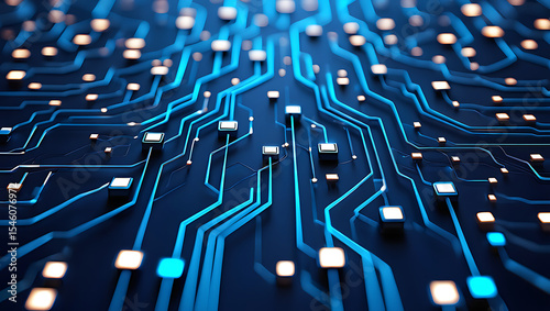 © Jam, Obraz premium Abstract AI circuit board background. Technology connected blue lines with electronics elements on tech bg. Computer motherboard with a chip, processor, and semiconductor. Digital vector illustration