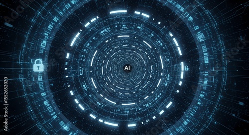 Fototapeta premium Abstract AI Data Tunnel with Glowing Circuitry and Security Locks.