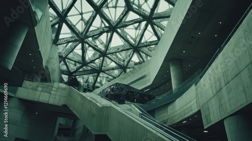 © Umi, Fototapeta premium Abstract architectural interior with complex geometric shapes, concrete structures, and an escalator.