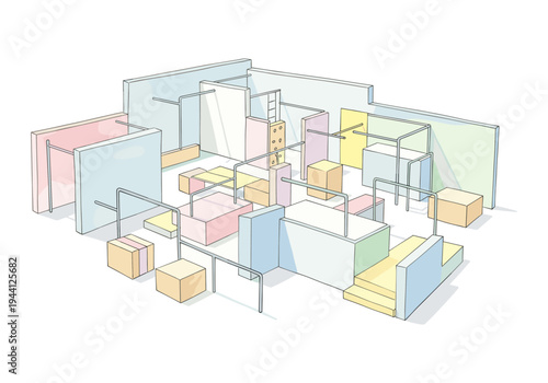 © LOBSTER LARRY, Fototapeta premium Abstract architectural model with pastel blocks and metal structures, isometric view