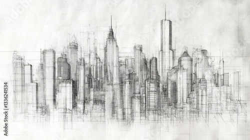 Naklejka premium Abstract architectural sketch of a city skyline, showcasing tall buildings...