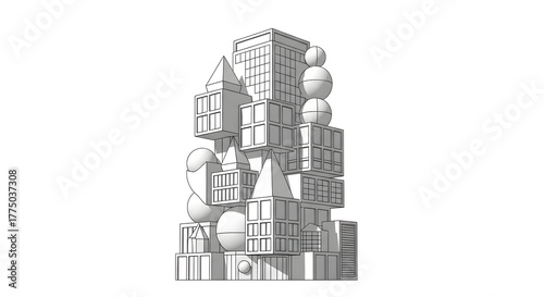 Obraz premium Abstract Architectural Sketch of Stacked Geometric Buildings and Spheres in...