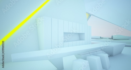 Fototapeta premium Abstract architectural white interior of a modern villa on the sea with colored neon lighting. 3D illustration and rendering.