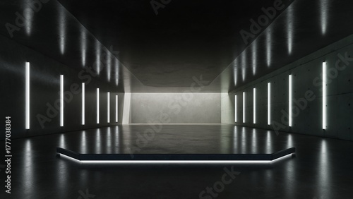 © nuchao, Fototapeta premium Abstract architecture background with neon light, Dark sci-fi interior design, Car presentation backdrop with empty futuristic concrete floor and wall