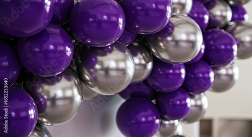 © fotostockuus, Fototapeta premium Abstract Arrangement of Purple and Silver Spheres with Reflective Surfaces.
