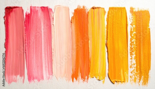 © dina, Fototapeta premium Abstract arrangement of strokes of different orange and pink shades of paint on a textured white surface. Warm color gradient, close-up perspective