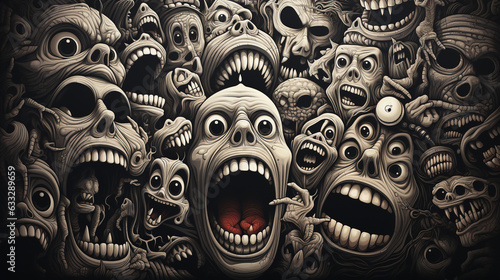 Naklejka premium abstract art, canvas covered in screaming faces, pain and fear, madness and...
