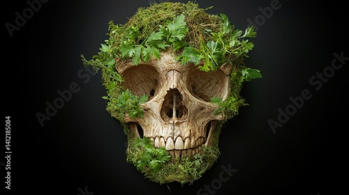 © Max, Naklejka premium Abstract art of a skull adorned with flora dark background digital artwork enigmatic environment artistic concept