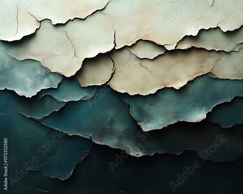 © Tahu, Obraz premium Abstract art with cracked, layered paint in teal and beige.