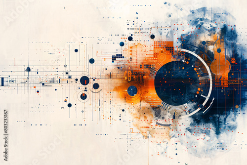 Obraz premium Abstract art with orange and blue hues featuring geometric shapes and splatter effects
