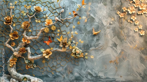 Obraz premium Abstract artistic background, flowers, branches, gold, and canvas painting....