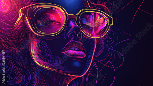 Fototapeta premium Abstract artistic image of a hipster girl, stylized neon outlines of a fashionable young woman with bright iridescent colors, huge glasses and bright lipstick