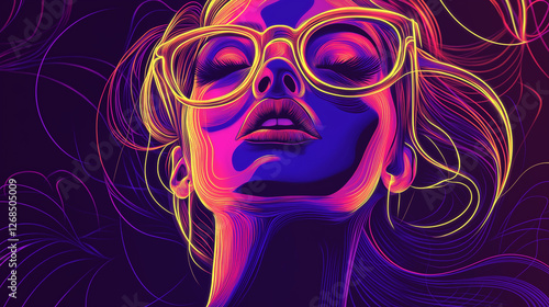 Fototapeta premium Abstract artistic image of a hipster girl, stylized neon outlines of a fashionable young woman with bright iridescent colors, huge glasses and bright lipstick