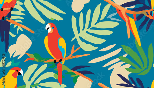 © Eli Berr, Naklejka premium Abstract artistic print with various leaves and parrots. Modern hand drawn collage contemporary seamless pattern.