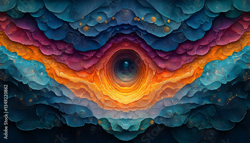 Fototapeta premium Abstract artwork depicting a deep, layered eye-like structure within a vibrant, swirling landscape of colors