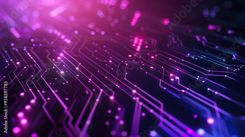 © Alina Tymofieieva, Fototapeta premium Abstract background. Close-up of a chip with techno lines in neon purple color. Technology concept.