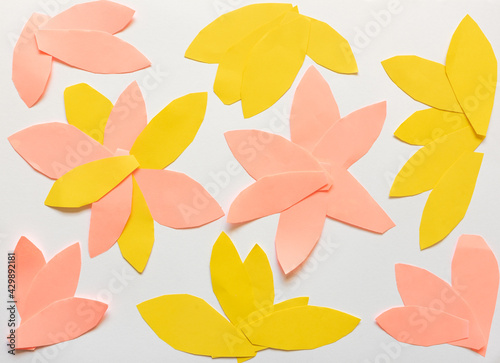© Natalie Board, Obraz premium Abstract background concept - petal shaped coral and yellow paper arranged like flowers on white